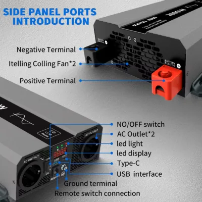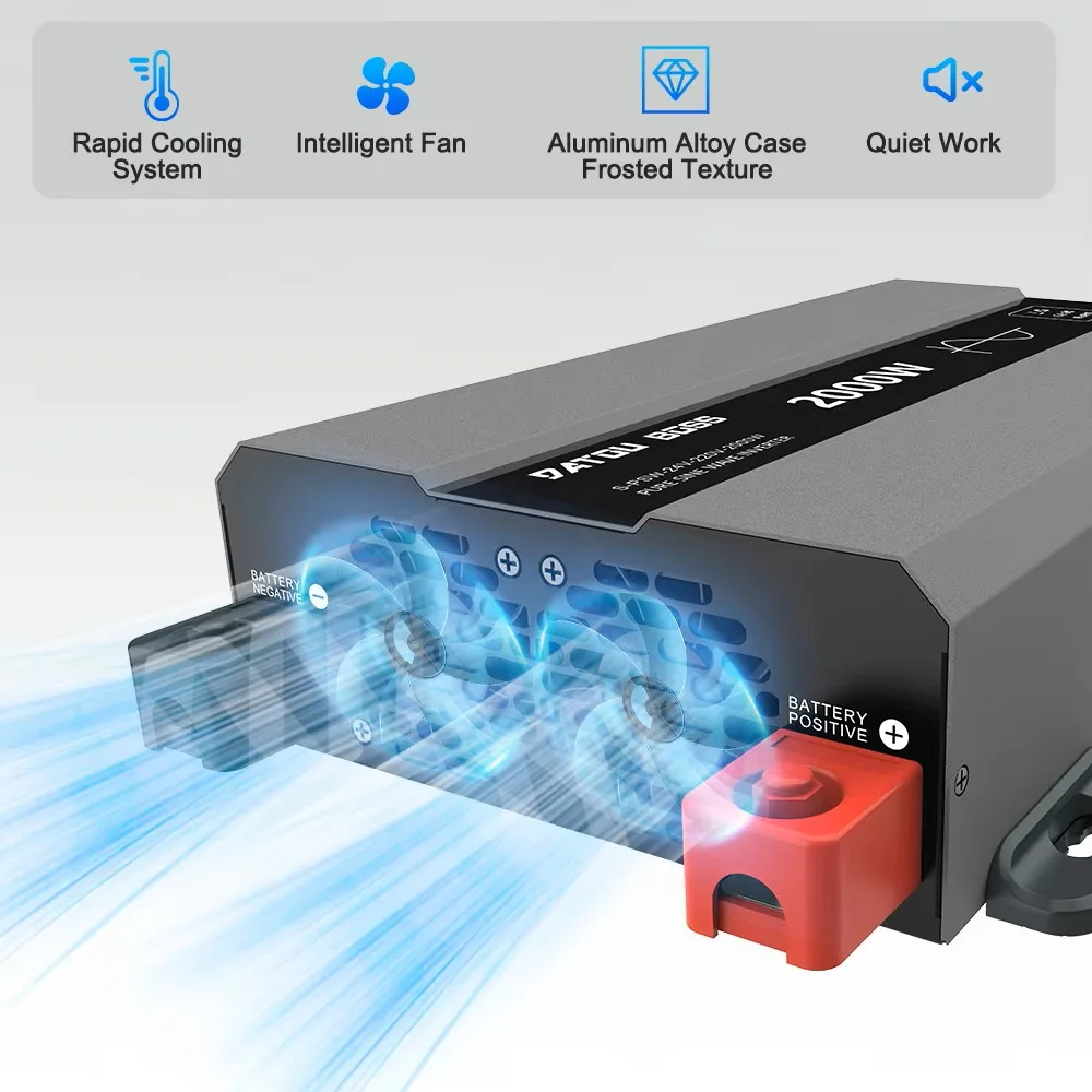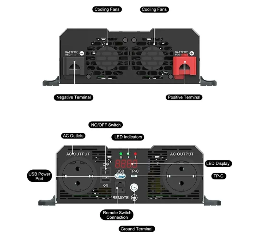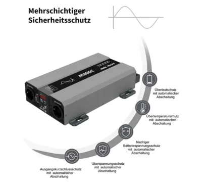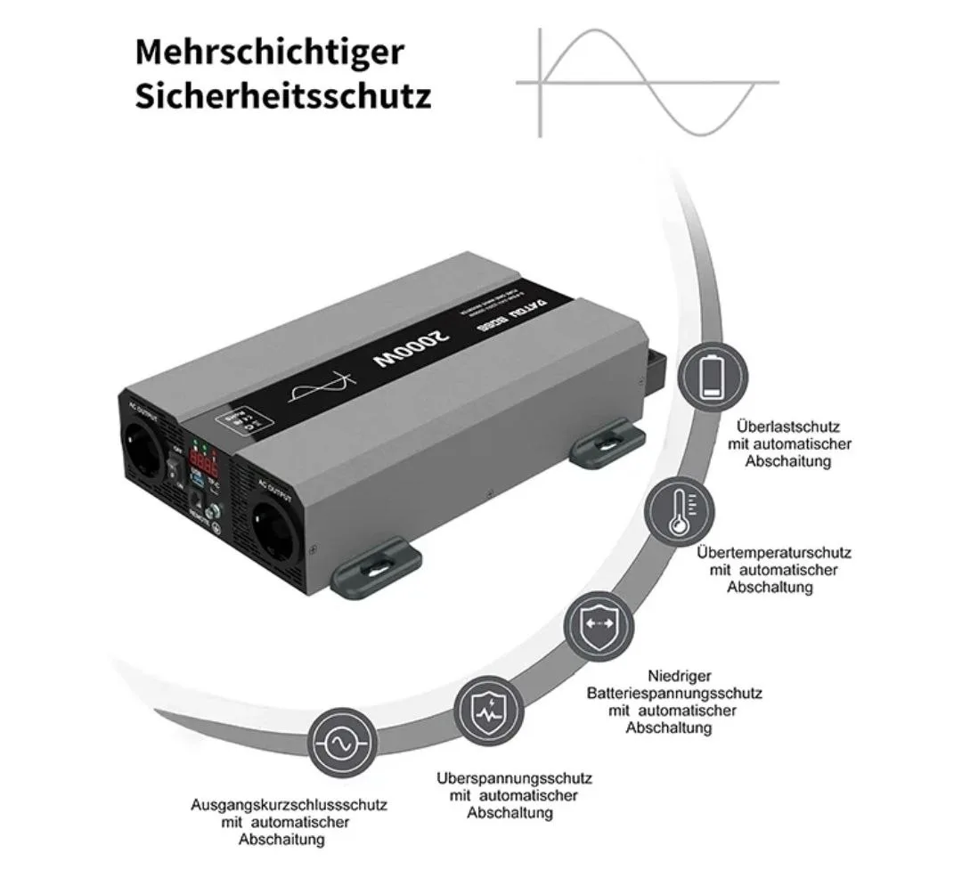 - Wyjście — czysta sinusoida (Pure Sine Wave) — bezpieczna dla każdej elektroniki